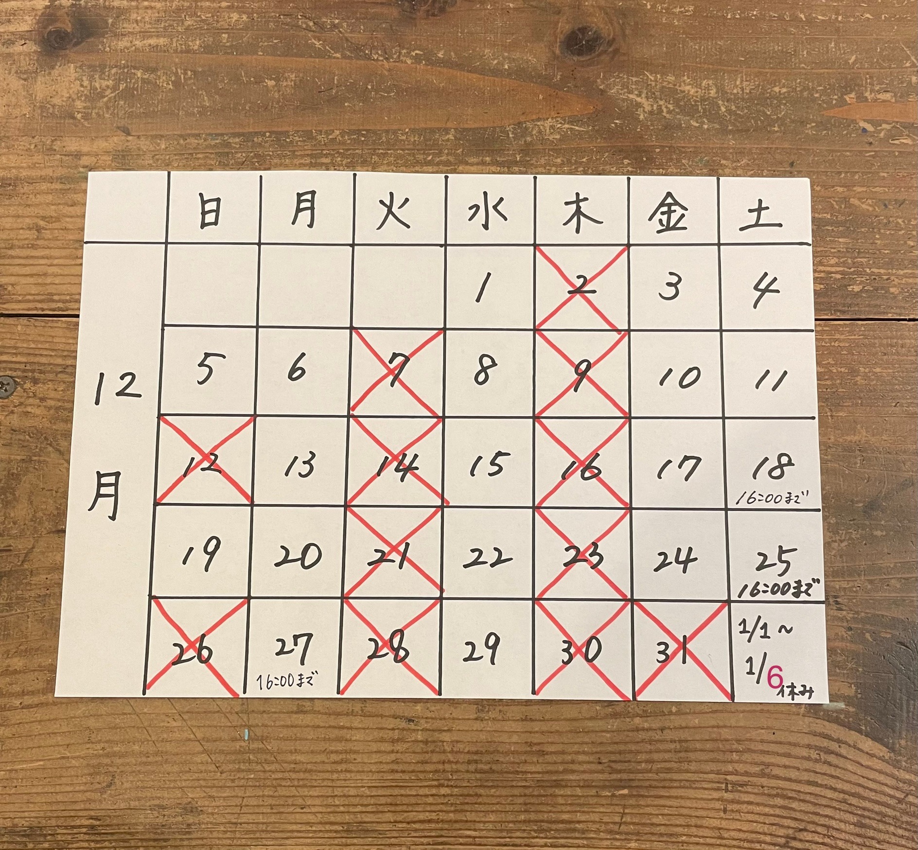 12月、そして来年1月のお休み、及び営業日のおしらせです。