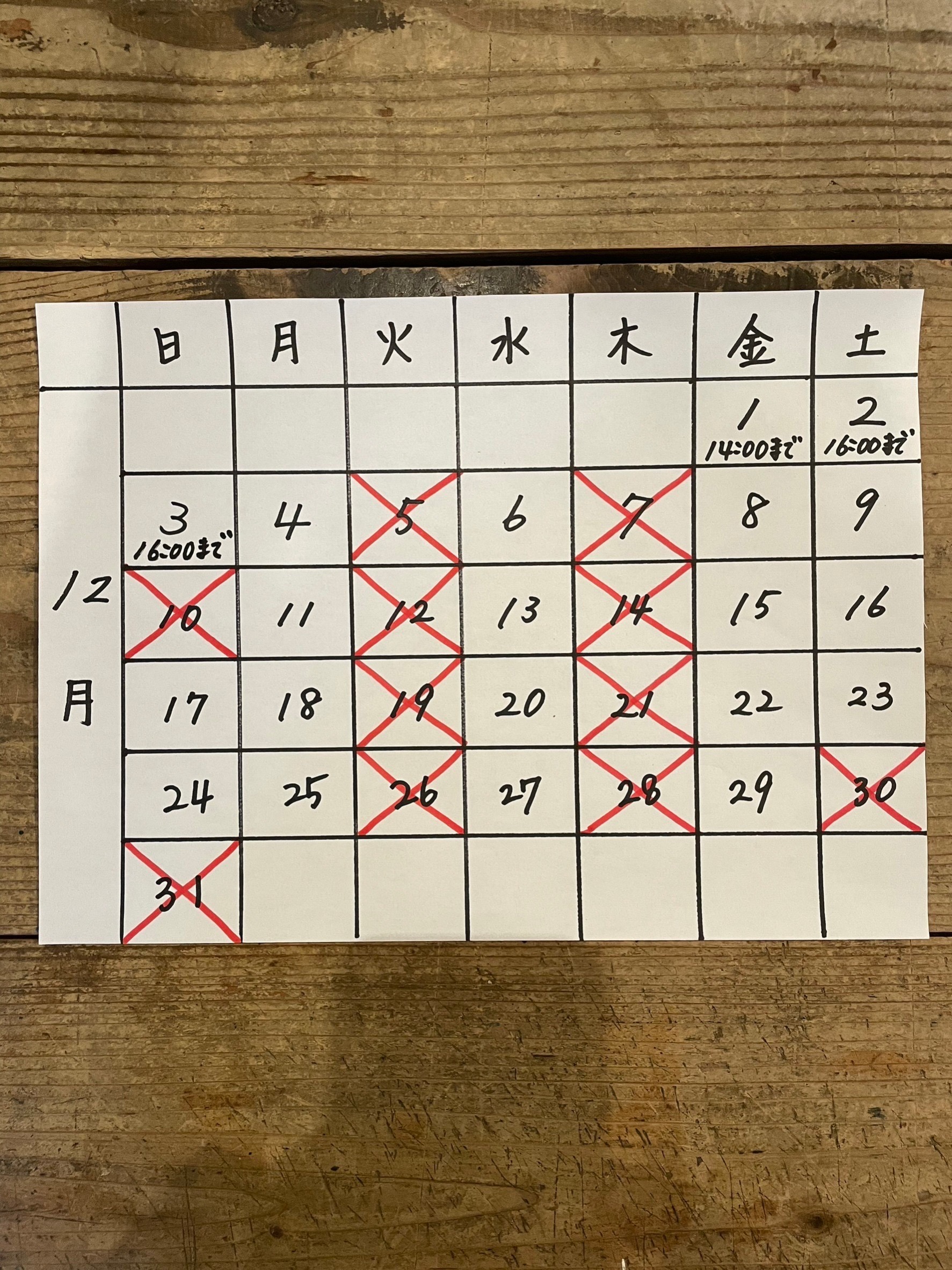 🔴12月30日(土曜日)から1月5日(金曜日)まで7日間、冬季休暇を頂きます。ご不便をおかけしますが、どうぞよろしくお願い致します。