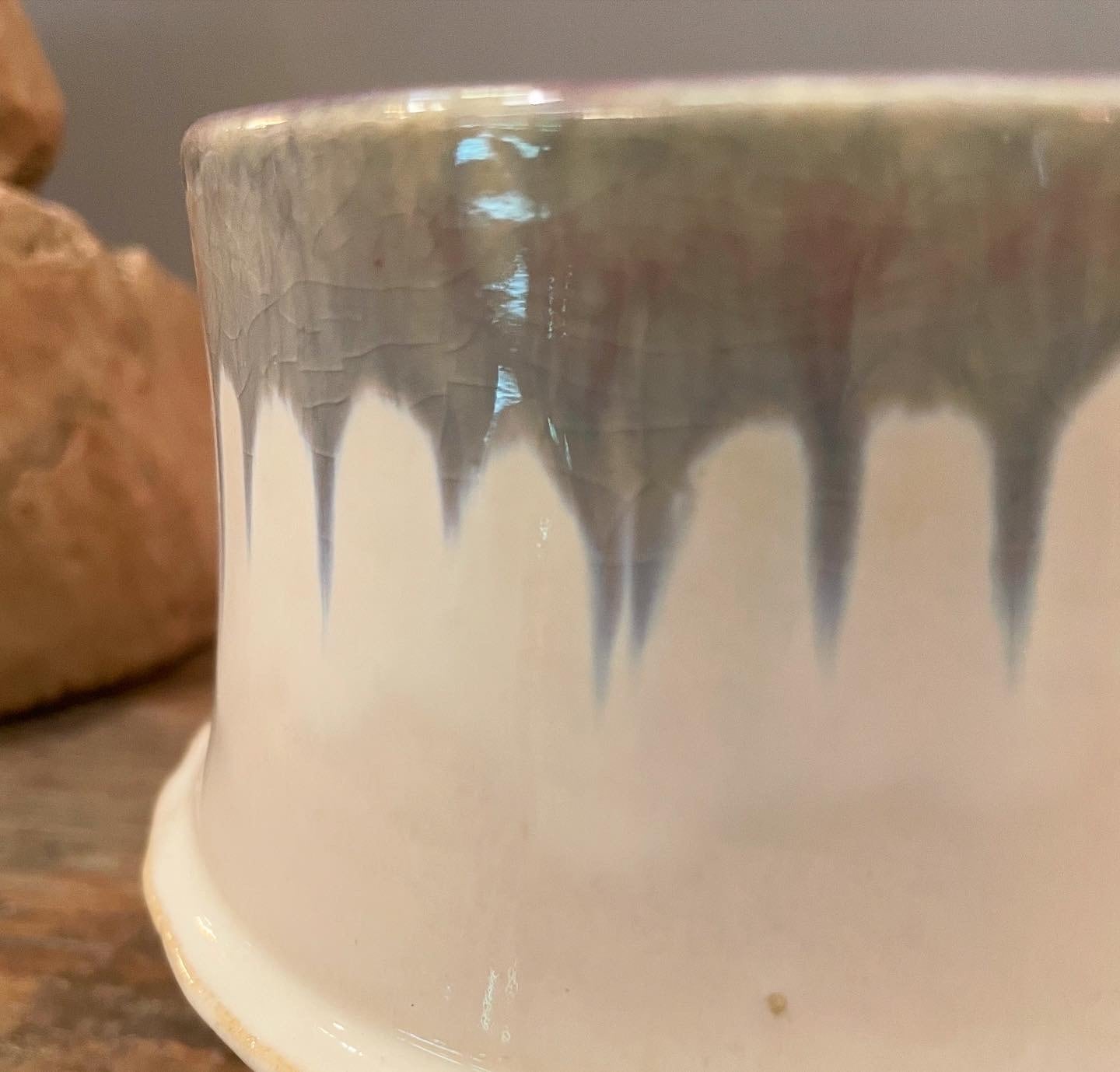 ホワイトに薄いグレーとパープルの釉薬ががかった艶のあるタイプ。