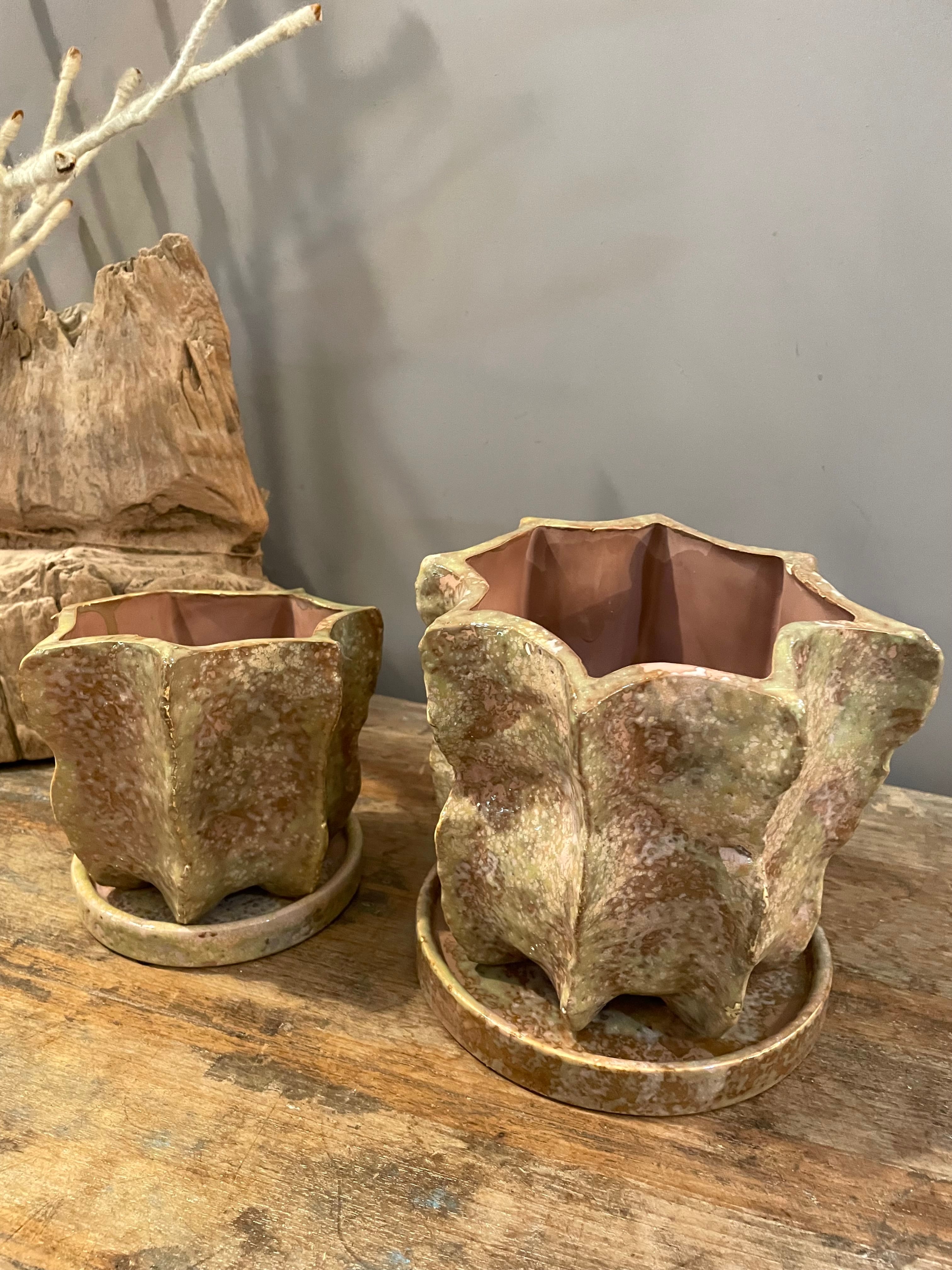 8面体の花弁のようなデザインがとっても可愛らしい鉢カバーです。