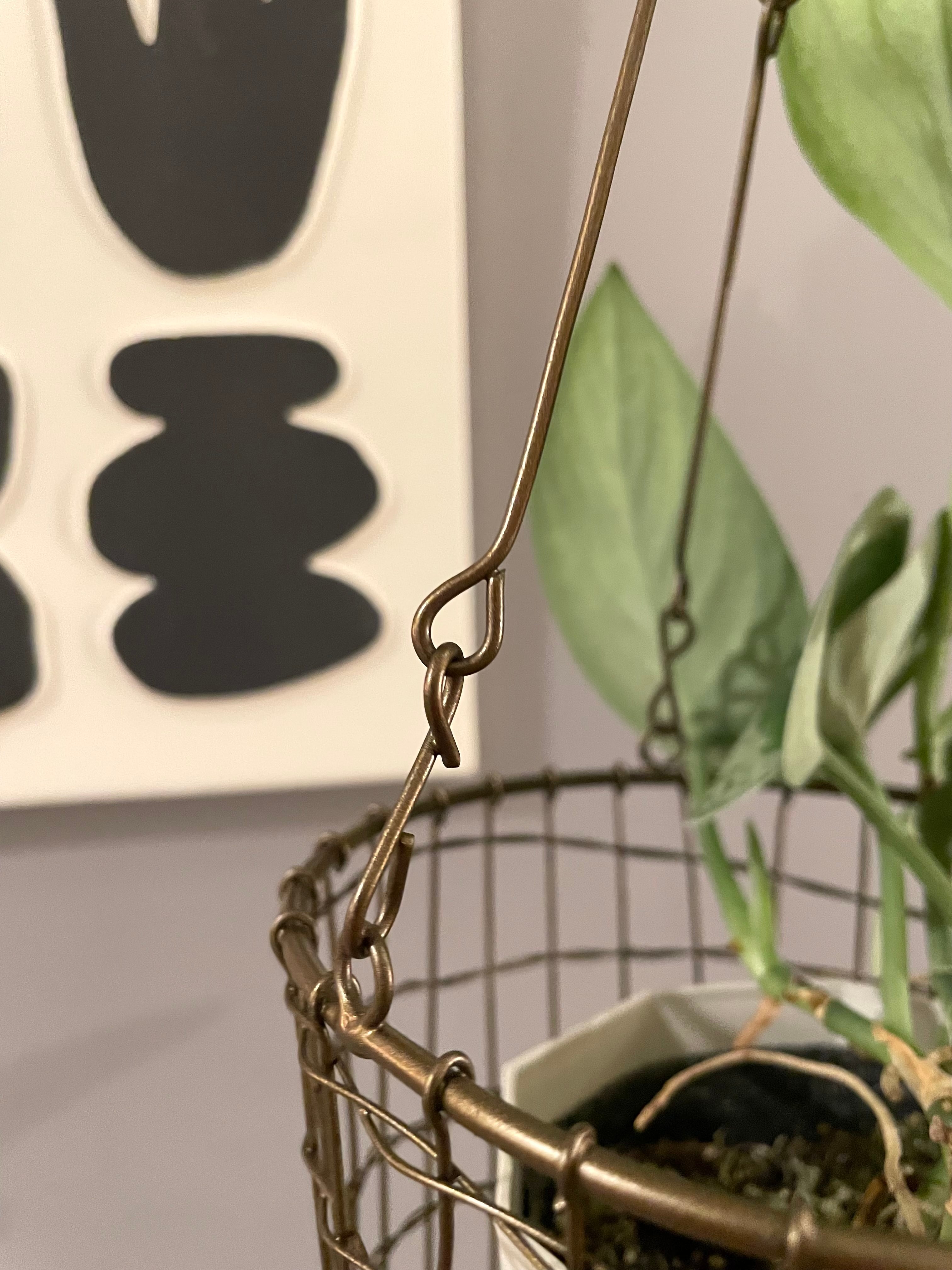・鉢植えなどを乗せて飾る場合、吊り下げる前に必ずバスケット全体の重心が安定しているか確認してください。軽く揺らしてみてぐらつきがないか、片側に傾いていないかなど、念入りにチェックしてください。