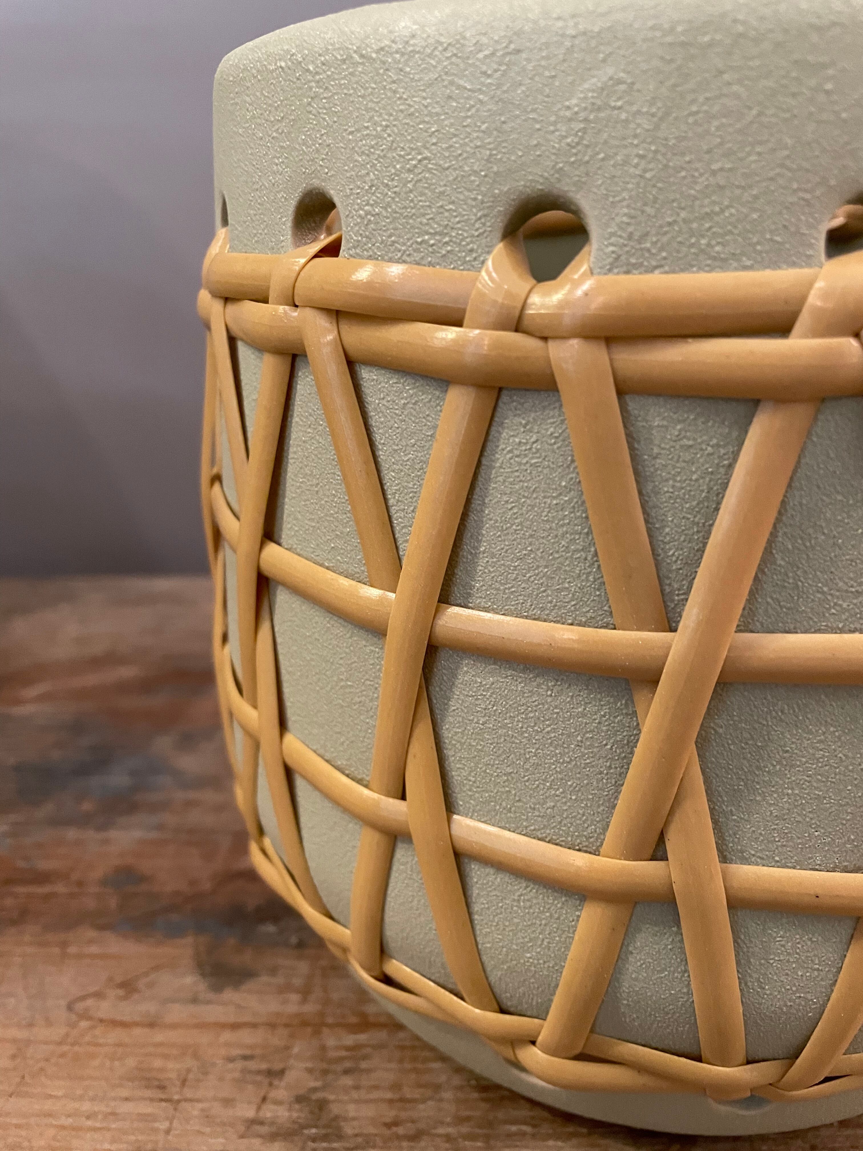 人工ラタン紐を使用して複雑に編み込まれた個性的な鉢カバー。