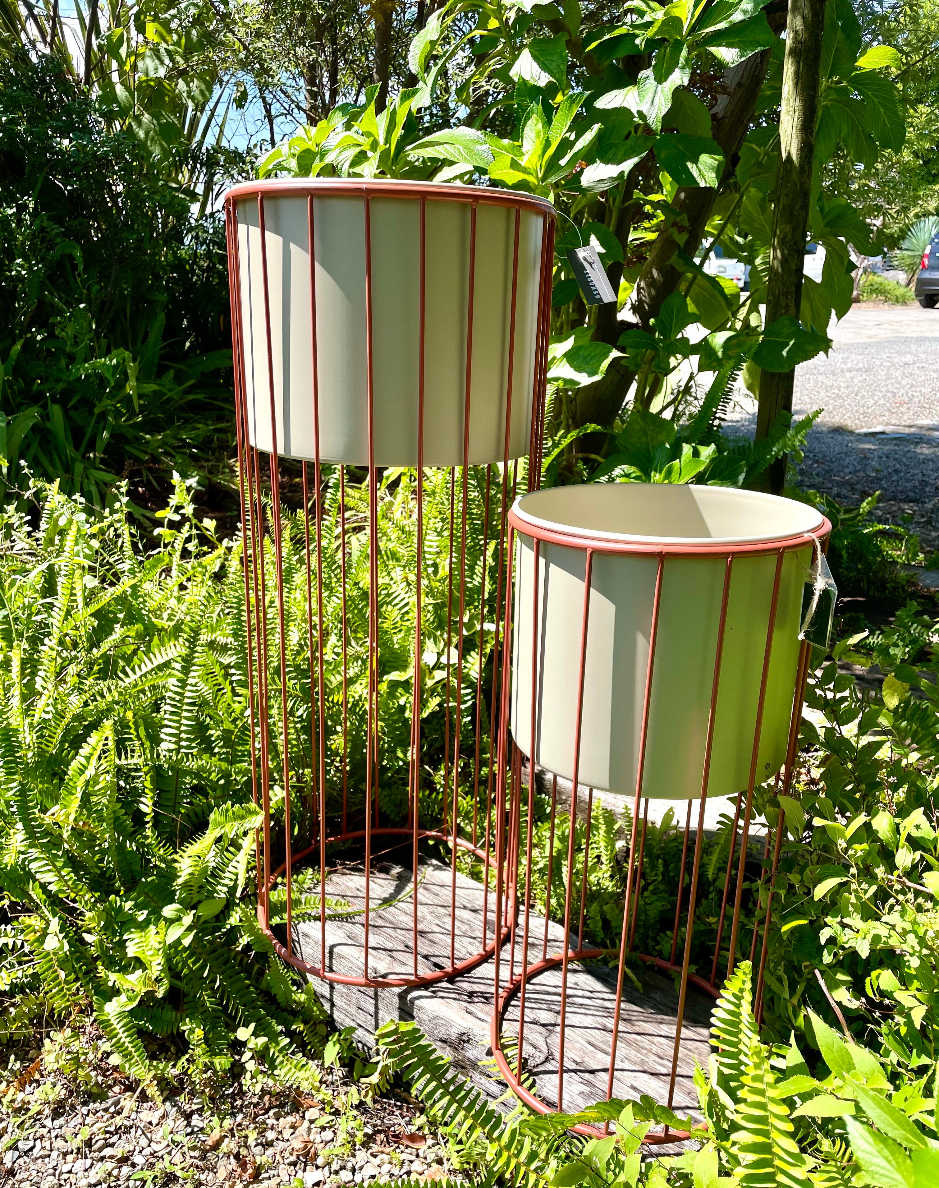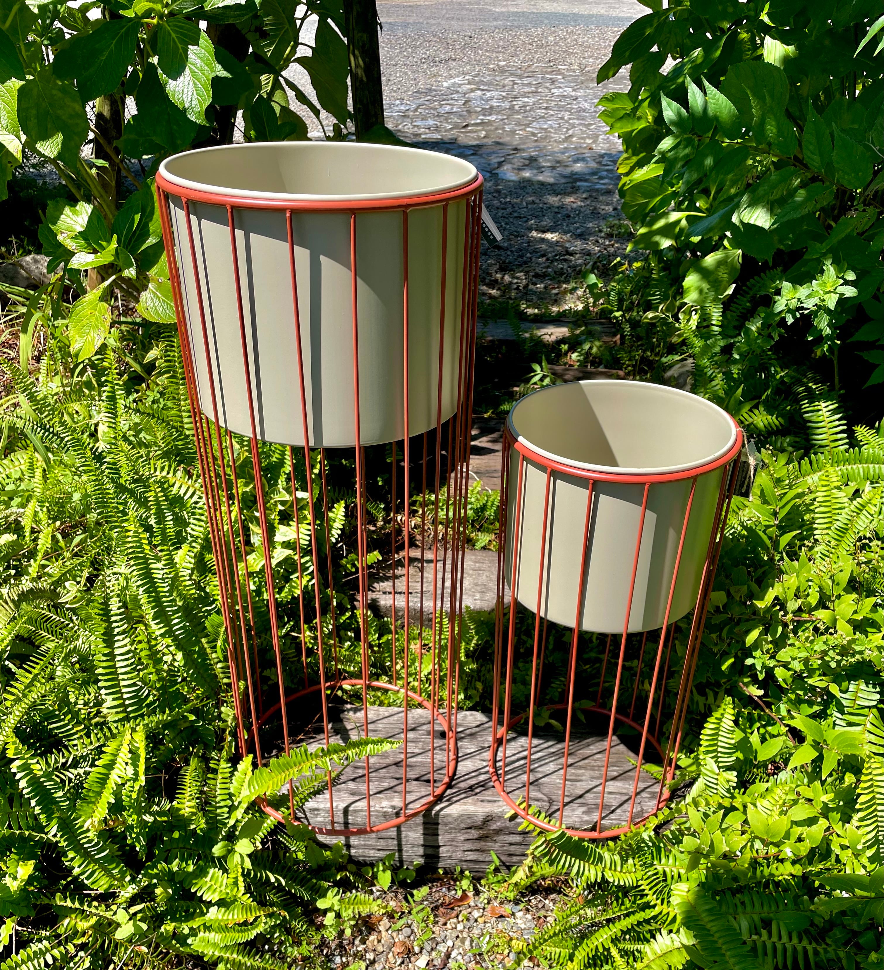 淡いサーモンピンクのスタンドにライトベージュの鉢カバー